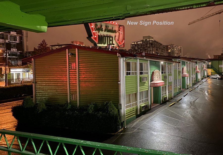 This is a model sign that I modelled and rendered and comped into this photograph as a Previs for VFX prior to shooting this scene.